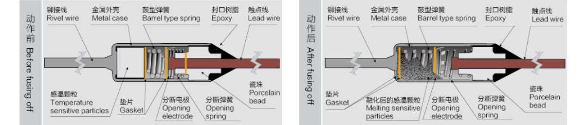När den omgivande temperaturen överstiger driftstemperaturen kommer de känsliga partiklarna att smälta av värmen från ledningstråden. Under detta tillstånd kommer öppningsfjädern att dras isär och den elastiska kraften kommer att trycka elektroden till fjädern för att bryta anslutningen med blytråden. Strömmen kommer också att avbrytas.